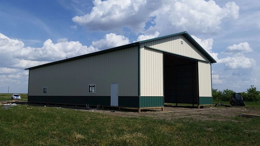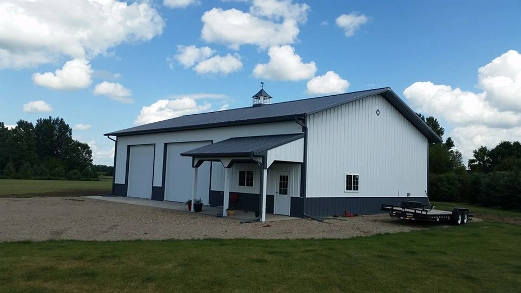 A clean and functional post-frame building in Bath, SD featuring a two-tone exterior, dual overhead doors, and a covered entry for both style and convenience.