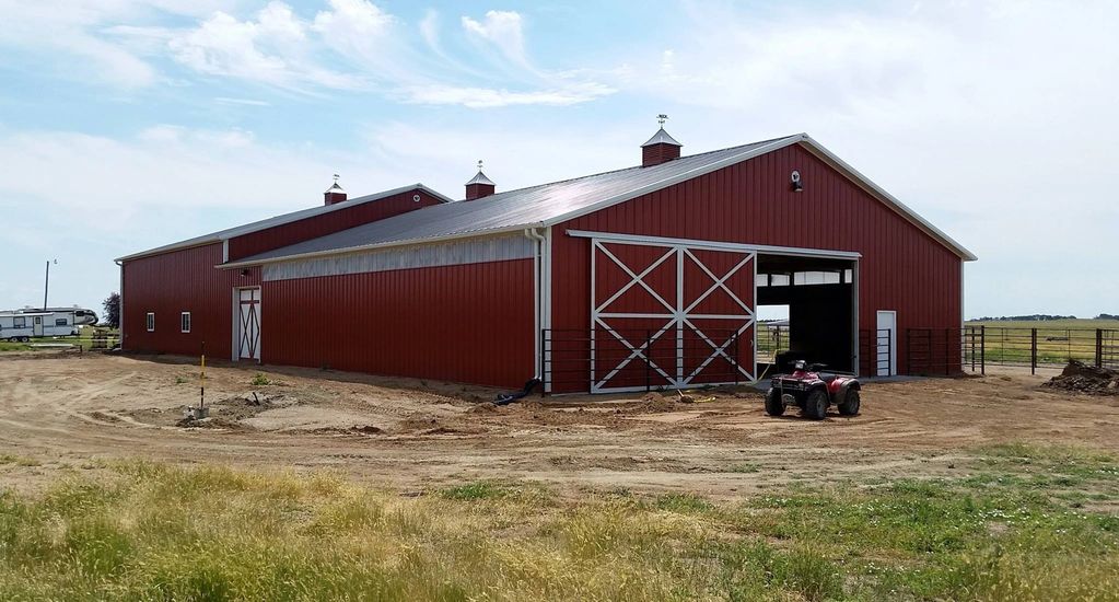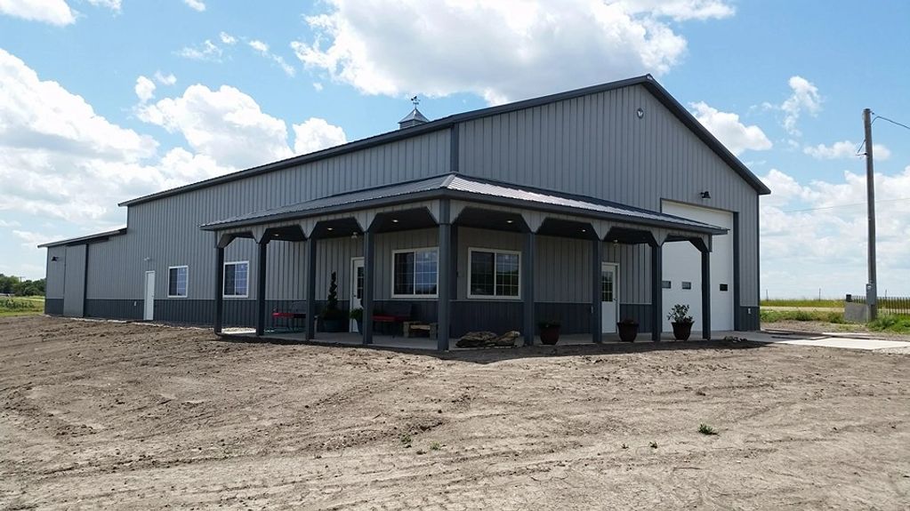 This custom post-frame building in Aberdeen, SD combines style and function with a two-tone steel exterior, spacious covered porch, and versatile interior—perfect for both living and working.