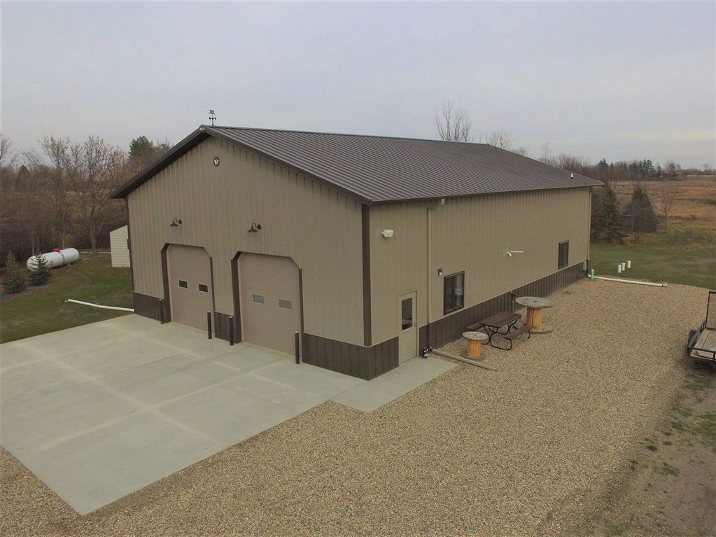 This post-frame building in Alcester, South Dakota features a modern, functional design built for versatility and durability. The exterior is finished with white steel siding and contrasting black trim, creating a clean and sharp appearance. Three large overhead doors provide easy access for equipment, vehicles, or shop use, while additional walk-in doors and windows add convenience and natural l